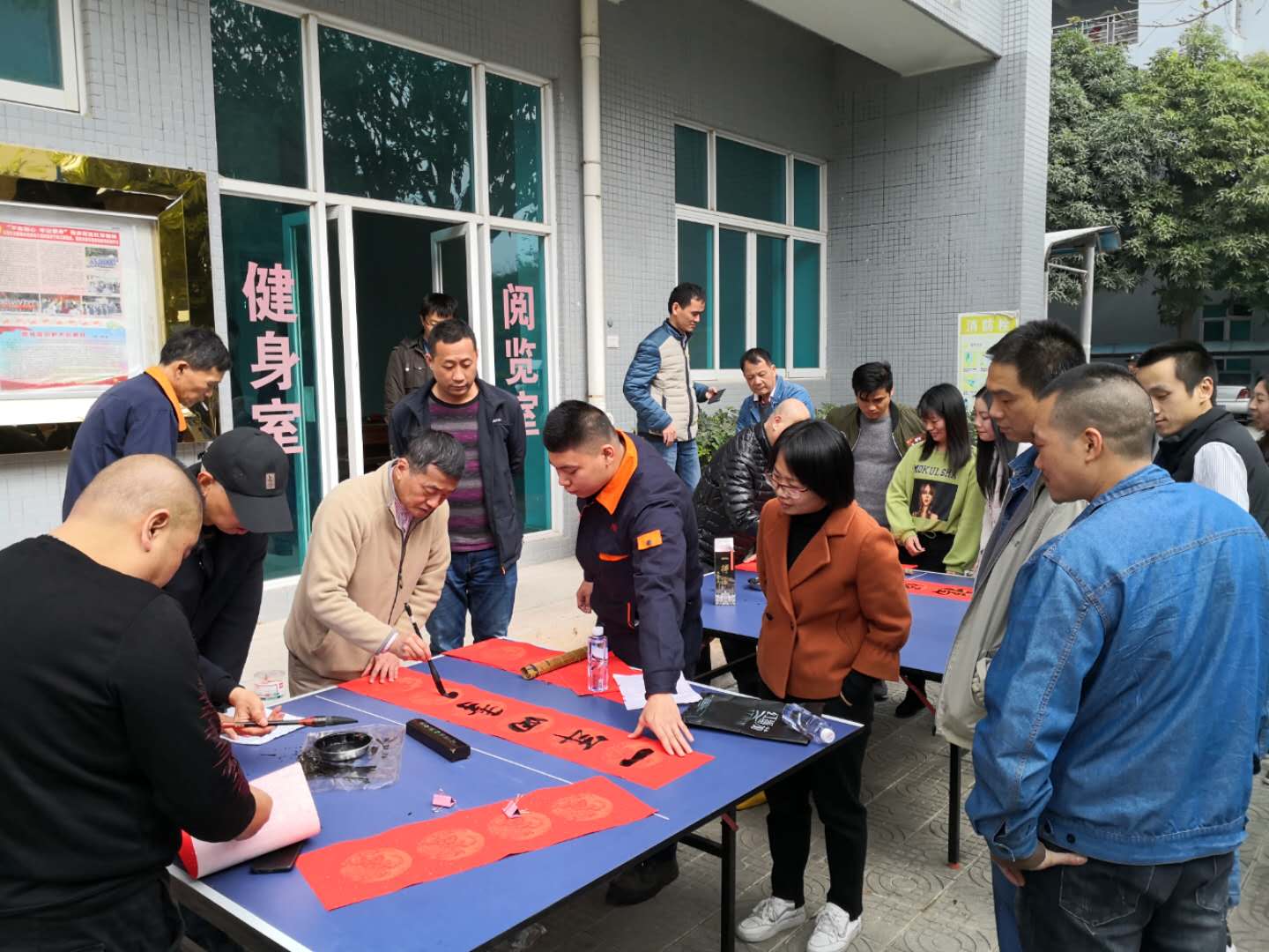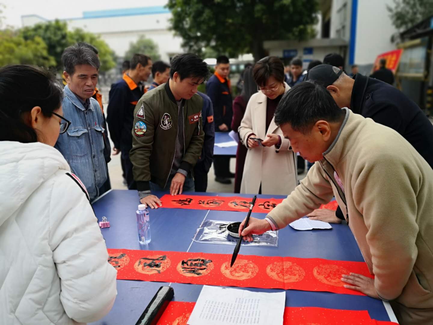 在公司宿舍樓下的乒乓球桌上,書法家們揮豪潑墨、妙手生輝,一幅幅春聯(lián)躍然而出。不斷從書法家的手中產(chǎn)生。員工們簇?fù)碓跁抑車?,不時(shí)地發(fā)出驚嘆。1月18日下午正是公司召開2019年度總結(jié)表彰大會(huì)的時(shí)間。許多前來(lái)參加大會(huì)的饒平生產(chǎn)基地員工也紛紛加入領(lǐng)贈(zèng)春聯(lián)的行列。